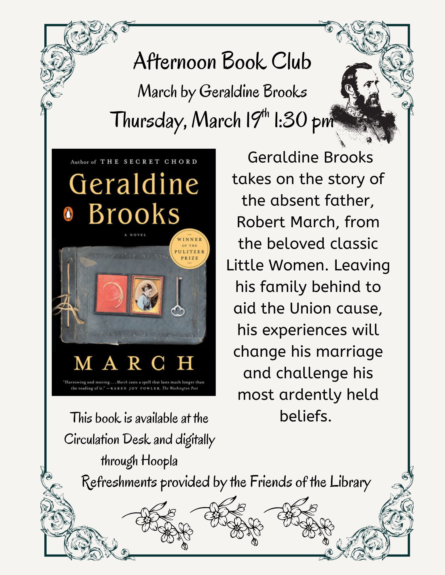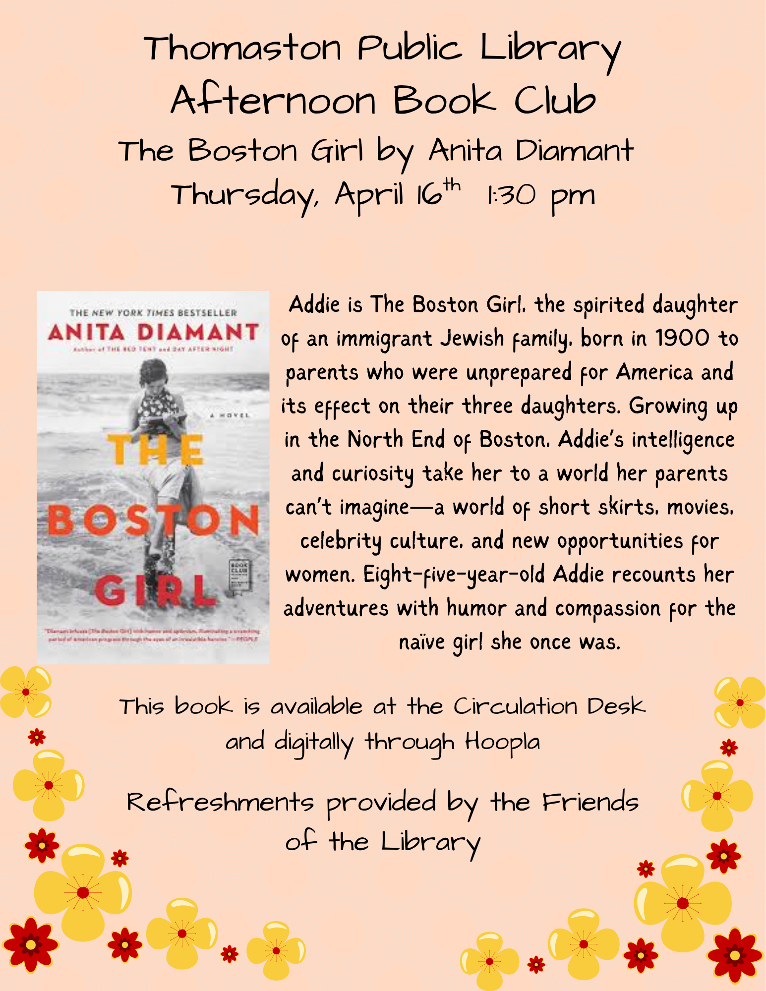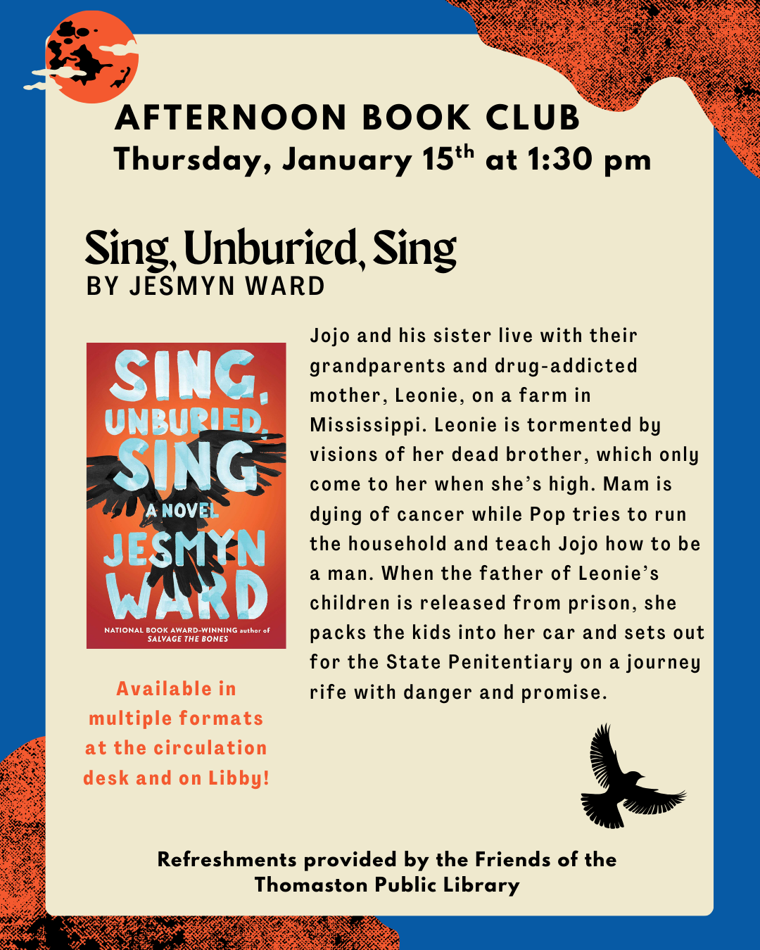Join us in the Community Room for our monthly Afternoon Delights Book Club! Each month we will read one book, then meet the third Thursday of the month at 1:30pm to chat about it.