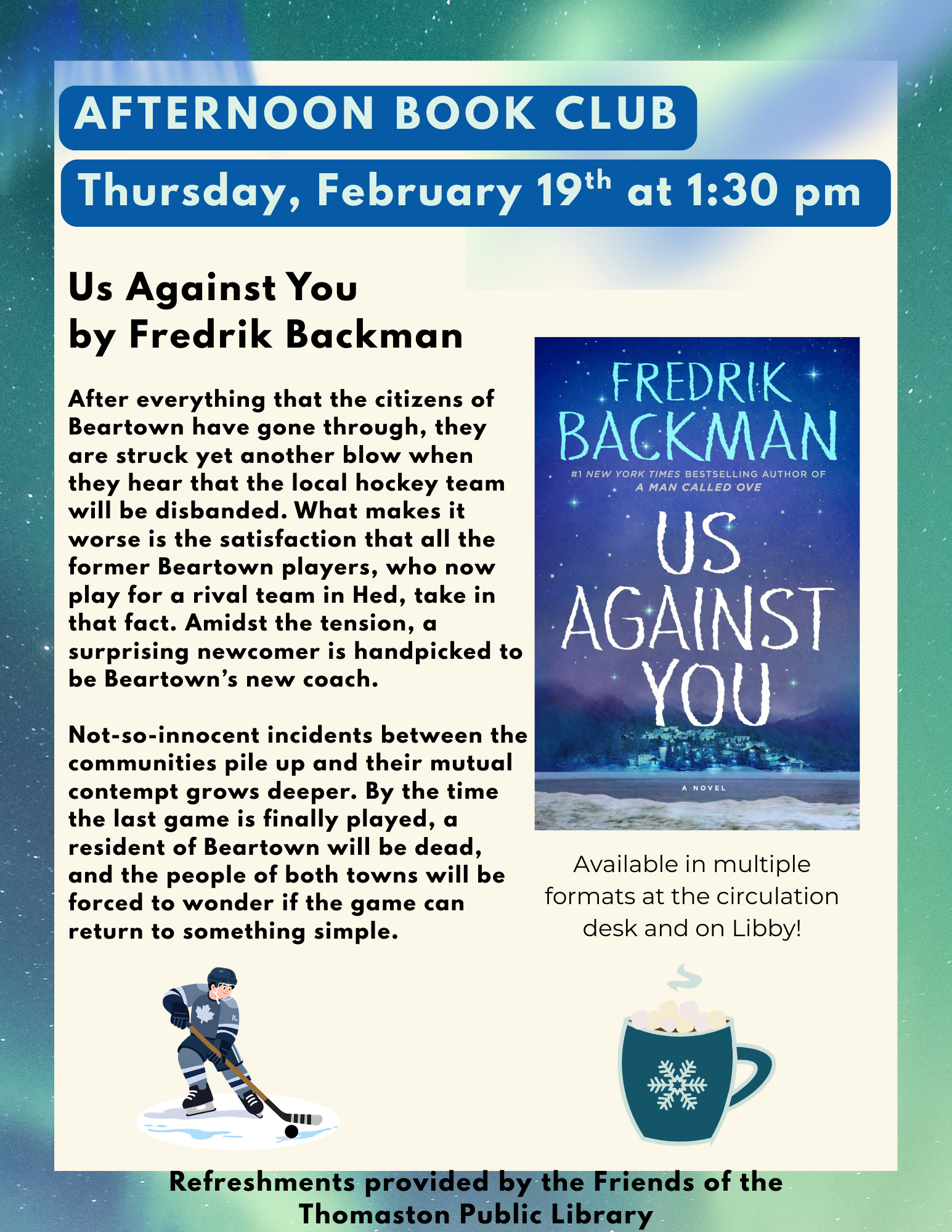 Multiple copies of each month’s selection (including Large Print and Audiobook copies when possible) are available to borrow at the library. Most are also available on Libby, the Palace Project, or Hoopla.
