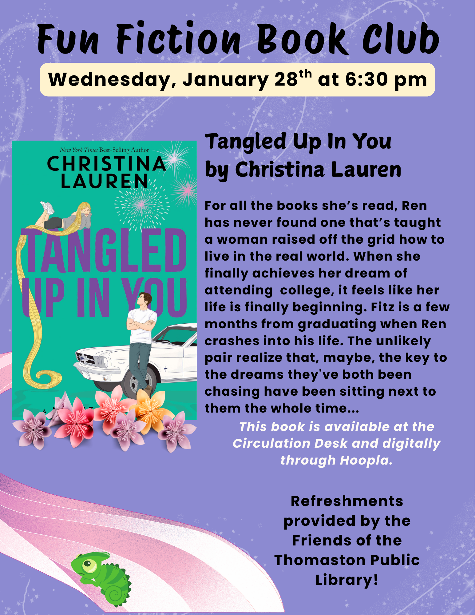Join us in the Community Room for our monthly Fun Fiction Book Club! Refreshments and Ice Breaker Game from 6:30 pm - 7:00 pm. 7:00 pm we start chatting about the book! Meets last Tuesdays of the month.