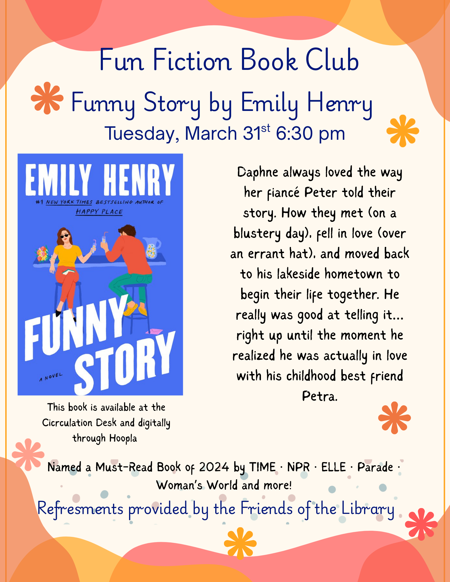 Join us in the Community Room for our monthly Fun Fiction Book Club! Refreshments and Ice Breaker Game from 6:30 pm - 7:00 pm. 7:00 pm we start chatting about the book!